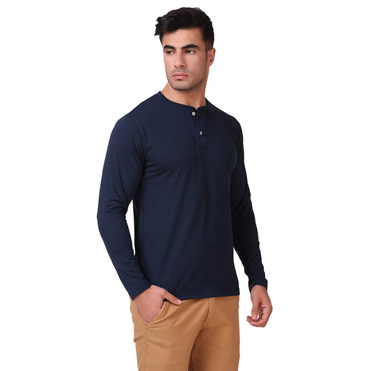 Navy Blue Henley Full Sleeves T-Shirt For Men